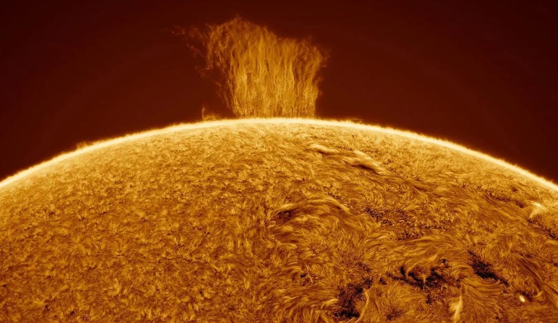 Last week an Argentinean astrophotographer captured a rare phenomenon on the surface of the sun called polar crown prominences (PCP). A polar crown prominence (PCP) is like a huge wall made of super-hot gas that shoots up from the surface of the Sun and then falls back down because of the Sun's magnetic fields. This is what gives it its nickname: solar waterfalls. This particular solar waterfall rose approximately 100,000 km above the sun’s surface.