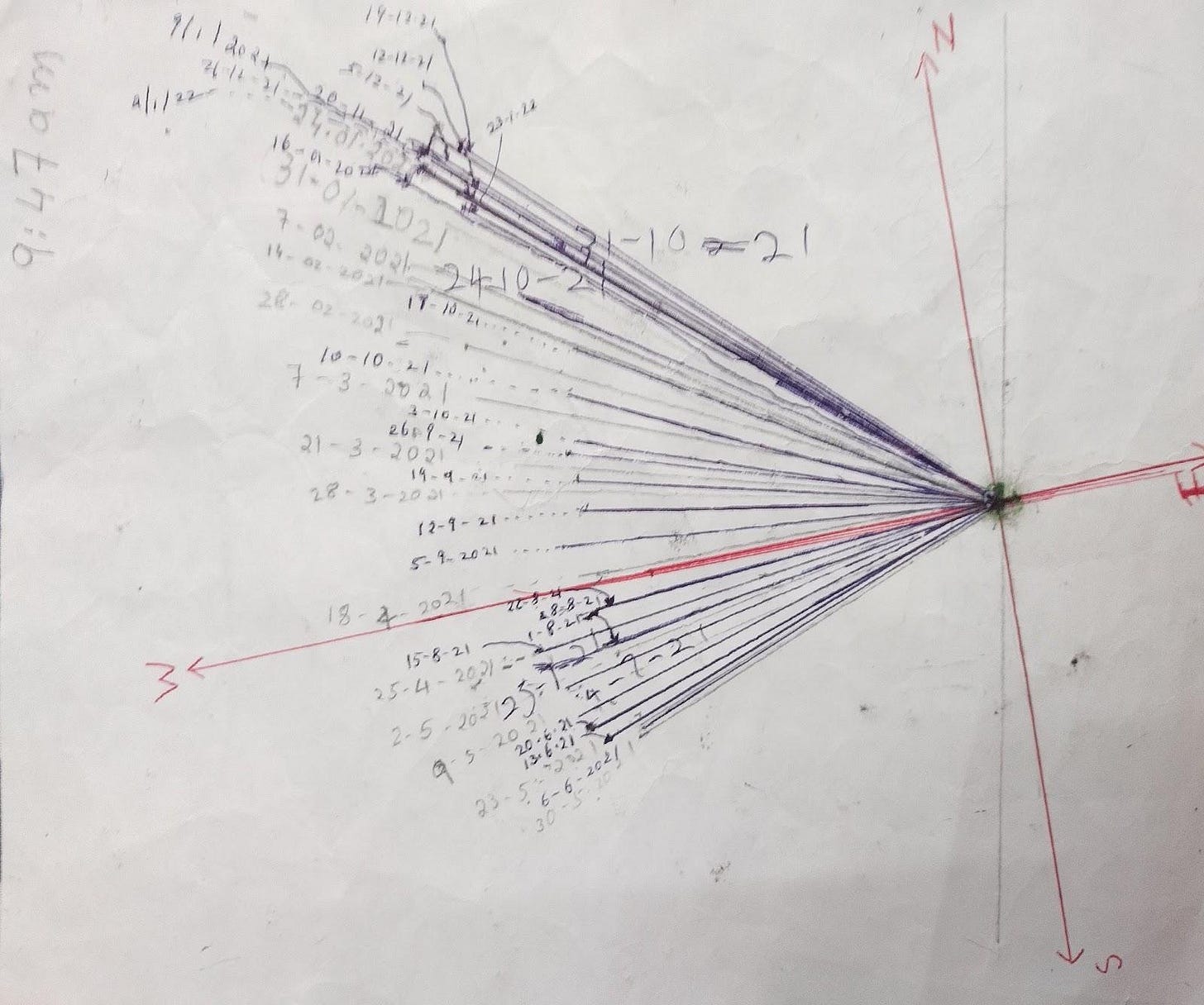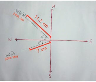In the following weeks, the shadow started moving towards the south and the shadows decreased in length. For example the next shadow was pointing in the direction W34o N with the length of 10.5 cm and so on. The shadows then continued moving south till 30th May 2021. On that day the shadow was 7 cm long and was pointing in the direction W21o S. From that day on, the shadows started moving towards the north and increased in size. The longest shadow was observed during December. Its length was 11.3 cm pointing W41o N.