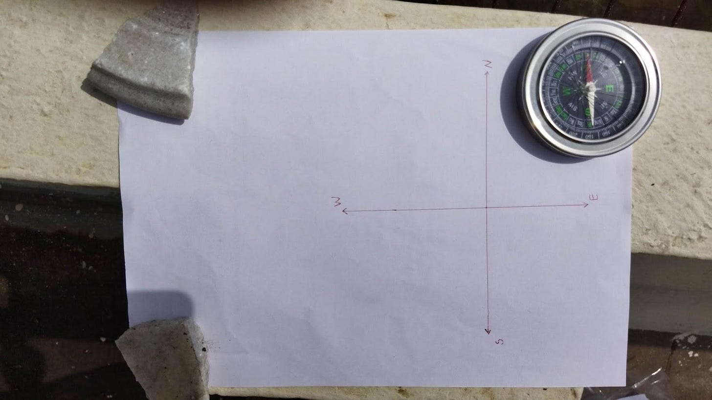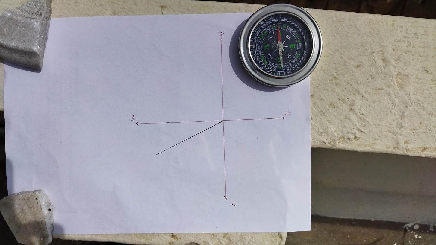 On the day we started, the shadow’s length was 11.2 cm and was pointing in the direction W41o N. How the directions are measured is shown below.