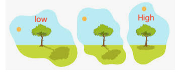 During summer and monsoon the Sun is higher up in the sky and in winter it is lower in the sky; being higher or lower in the sky does not mean that the Sun is farther or nearer to the earth. When the Sun is higher up in the sky, a shorter shadow is formed (see the picture of the tree below, Fig.9). When it is low in the sky a longer shadow is formed.