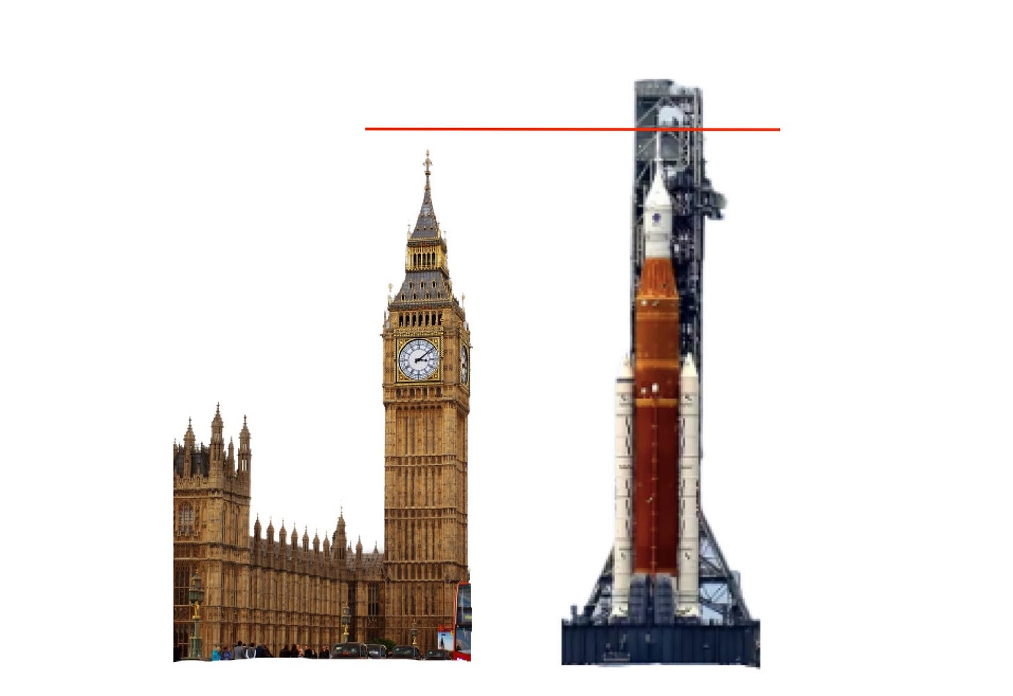 How big do you think the Artemis 1 rocket is? The size of a tree? The size of a house? The answer is the size of a 32-story building or 98 meters. Here is a size comparison with Big Ben.