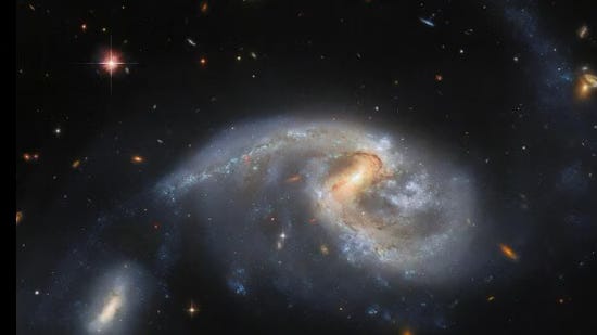 Last week, the Hubble telescope captured 2 galaxies 160 million lightyears away that were so close to each other that they were gravitationally tugging at each other. These massive gravitational forces have resulted in one galaxy pulling a little too hard on the other, such that its shape is being distorted and causing it to sprout a long starry tail.